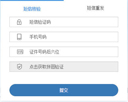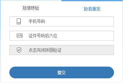 單擊 短信重發 ,進入核驗短信重發頁面。填寫您需驗證的手機號碼和證件號碼后 6 位數,完成圖形驗證,然后單擊 提交 。