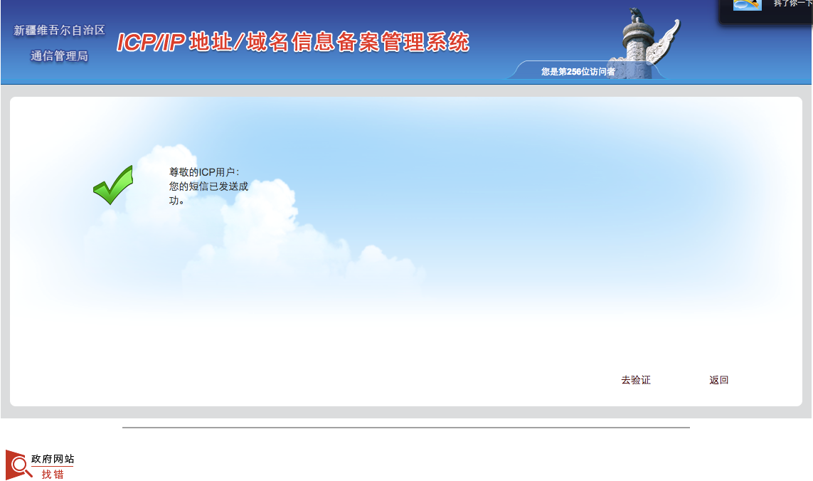 需驗證的手機號碼收到工信部發出的驗證碼短信后,請及時登錄備案省市管局網站,完成短信驗證。